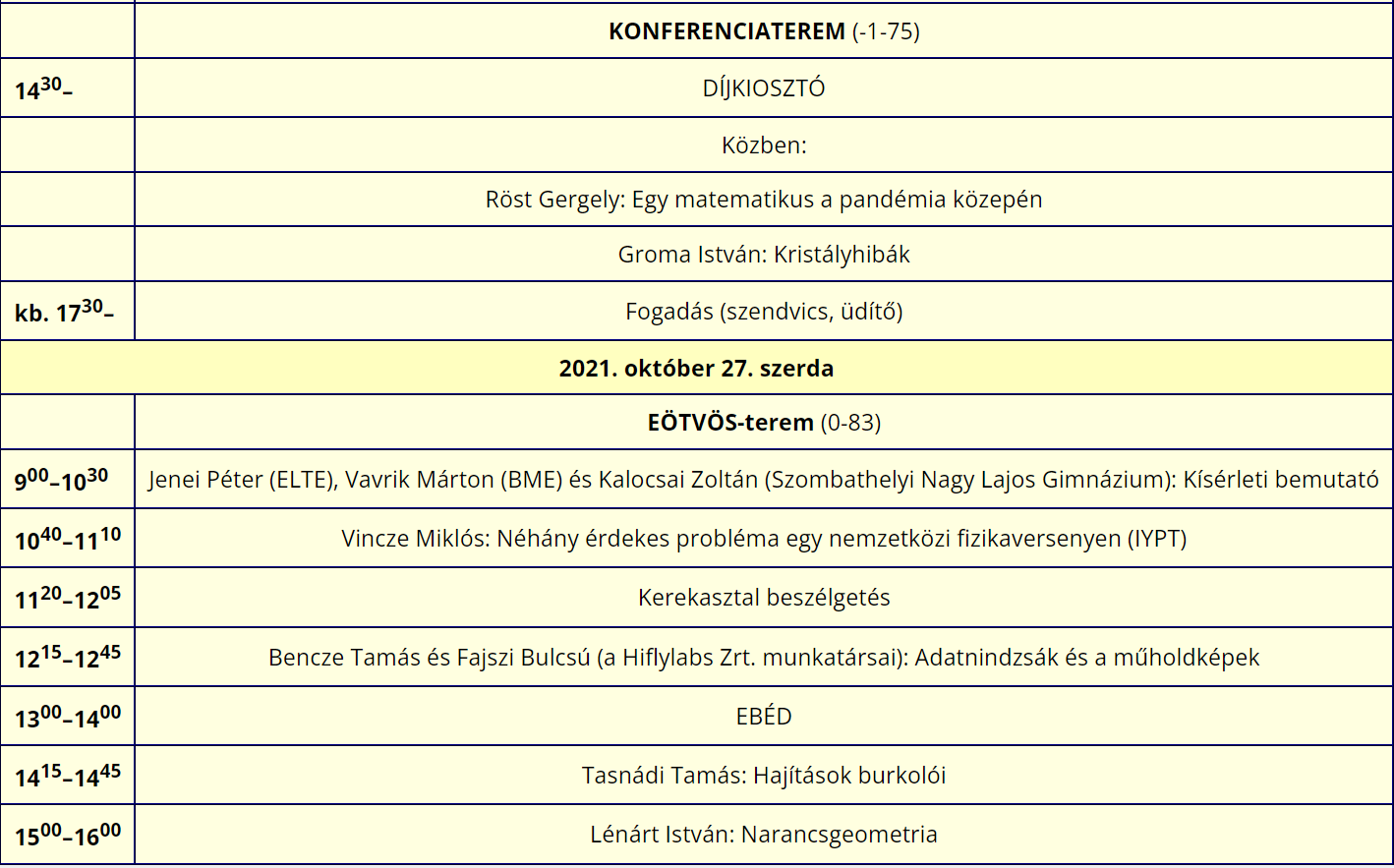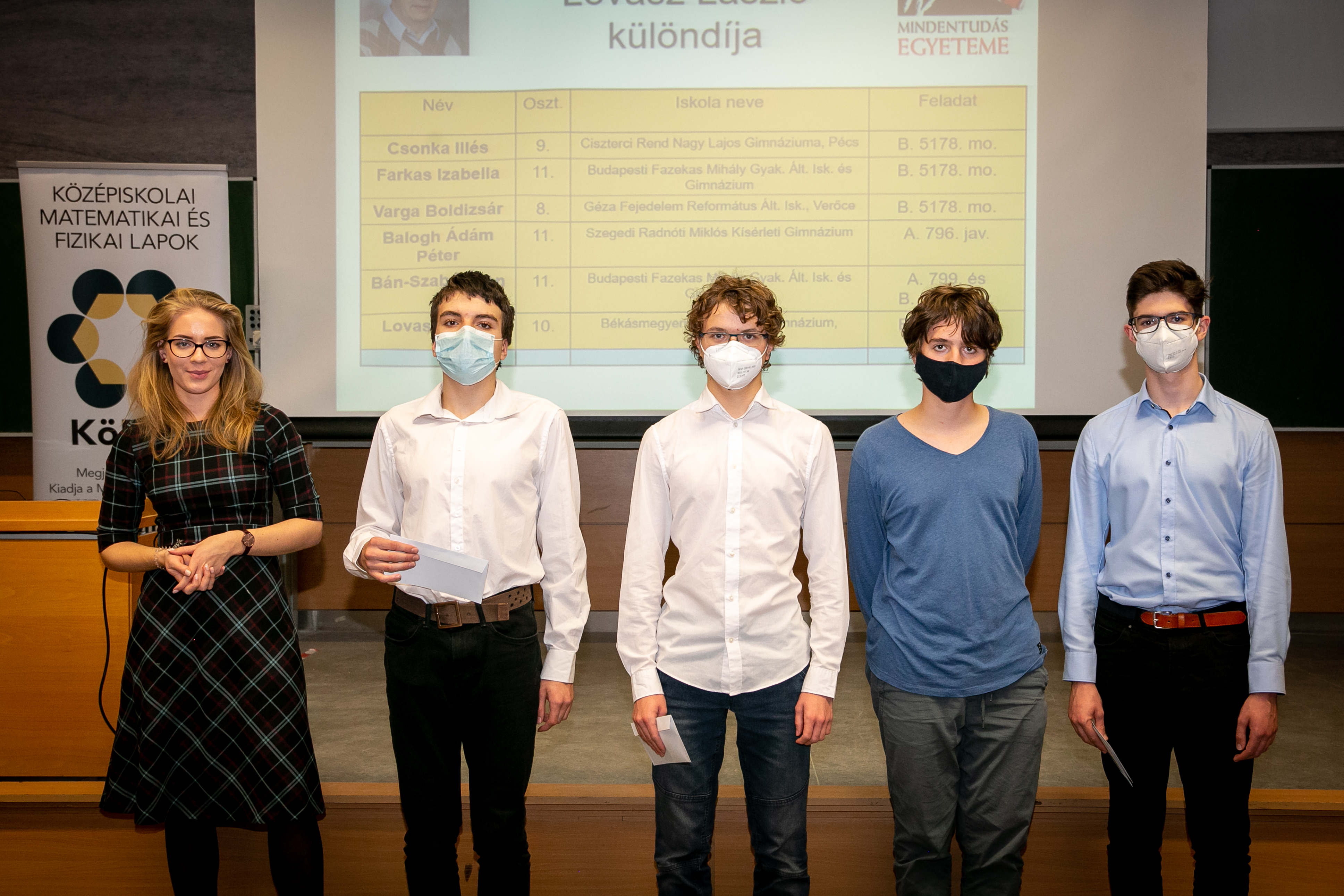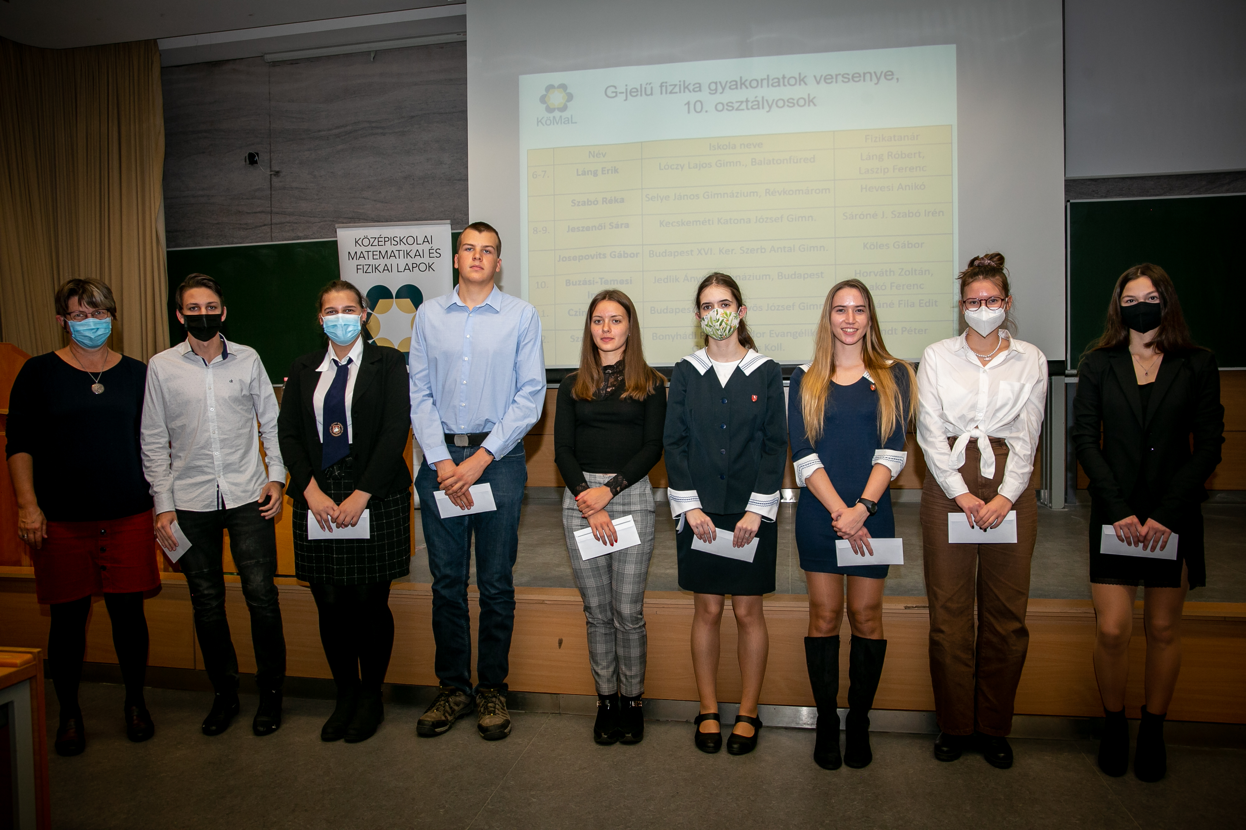 A díjak átadásán túl két érdekes előadást is meghallgathattak a résztvevők: Röst Gergely a Szegedi Tudományegyetem Alkalmazott és Numerikus Matematika Tanszékének vezetője, a Járványmatematikai modellező és epidemiológiai elemző munkacsoport tagja beszélt a pandémia és a matematika kapcsolatáról, Groma István egyetemi tanár, az MTA doktora, az ELTE TTK Fizikai Intézet Atomfizikai Tanszékének oktatója pedig a kristályszerkezetekről és még sok egyébről adott elő a fizika iránt érdeklődők örömére.