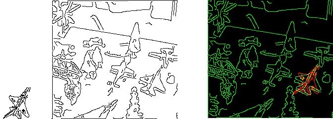 Az alakfelismerés szempontjából a Hausdorff-távolságnak van egy gyenge pontja. Gondoljunk arra, hogy mi történne, ha a 4. ábrán látható kis repülőt (amit a középső képen fel kell ismerni)