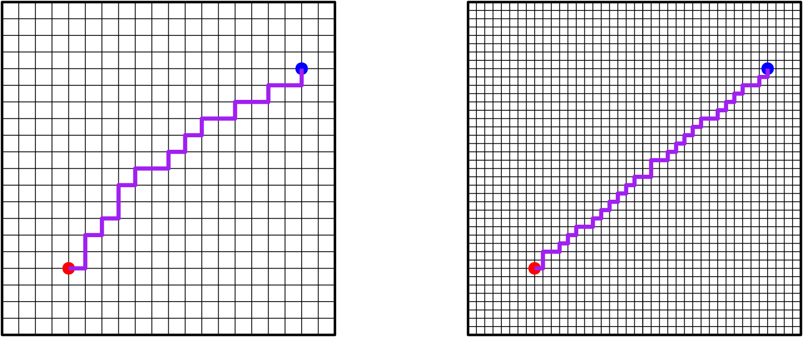 Persze gondolhatjuk, hogy minél finomabb rácsot veszünk, annál jobban fog hasonlítani az utunk a megszokotthoz, azaz ahhoz, amikor a négyzetlap két pontját egyenes vonallal kötjük össze.