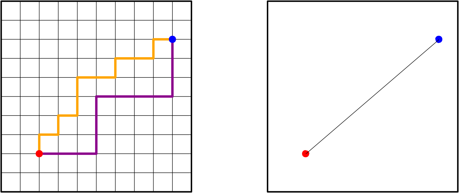 9. ábra. Legrövidebb út a rácson és a hagyományos négyzetlapon.